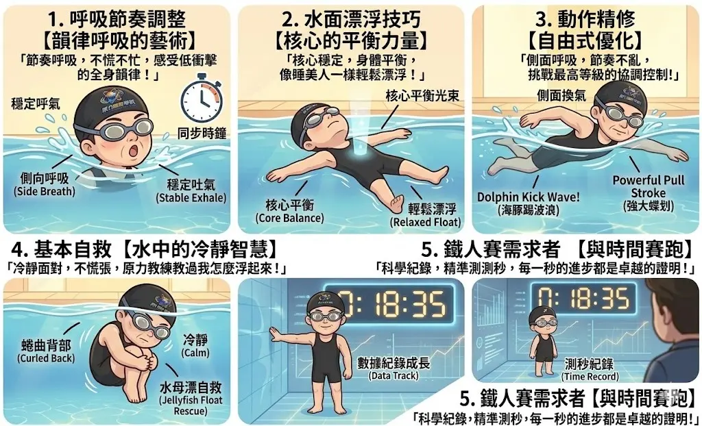 系統化教學原力體育:四大階段系統化教學,從安全運動到競技體育在原力體育學院,我們深知每位學員的起點不同。我們將專項運動訓練拆解為四大系統模組,確保無論是初入水池的幼兒,還是尋求突破的成人,都能在最適合的節奏下穩定進步。